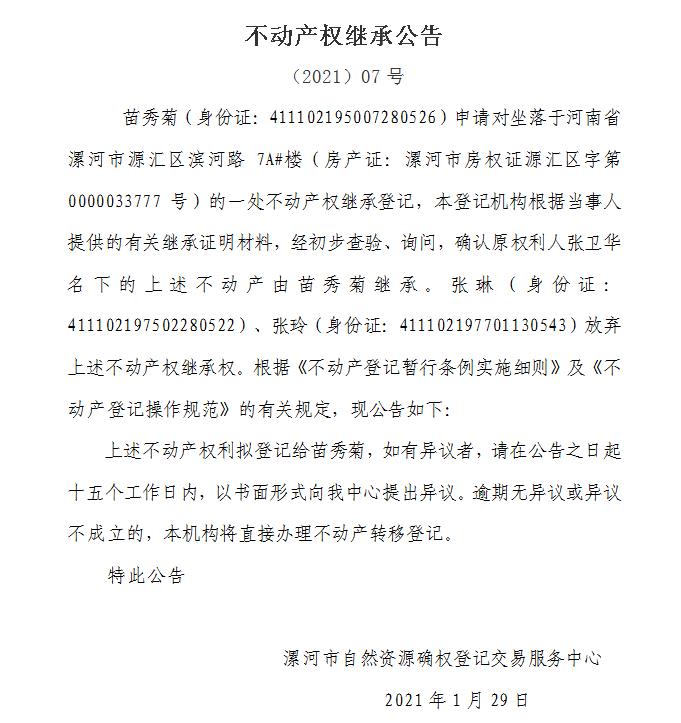 漯不动产权继承公告(2021)07号